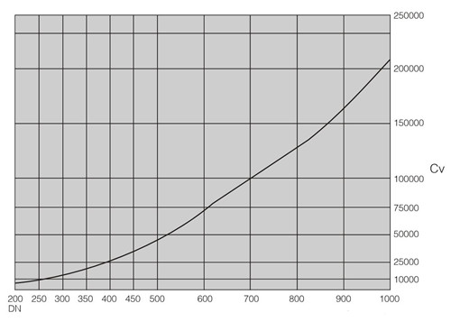 带导流孔型平板闸阀的DN-Cv曲线图 |